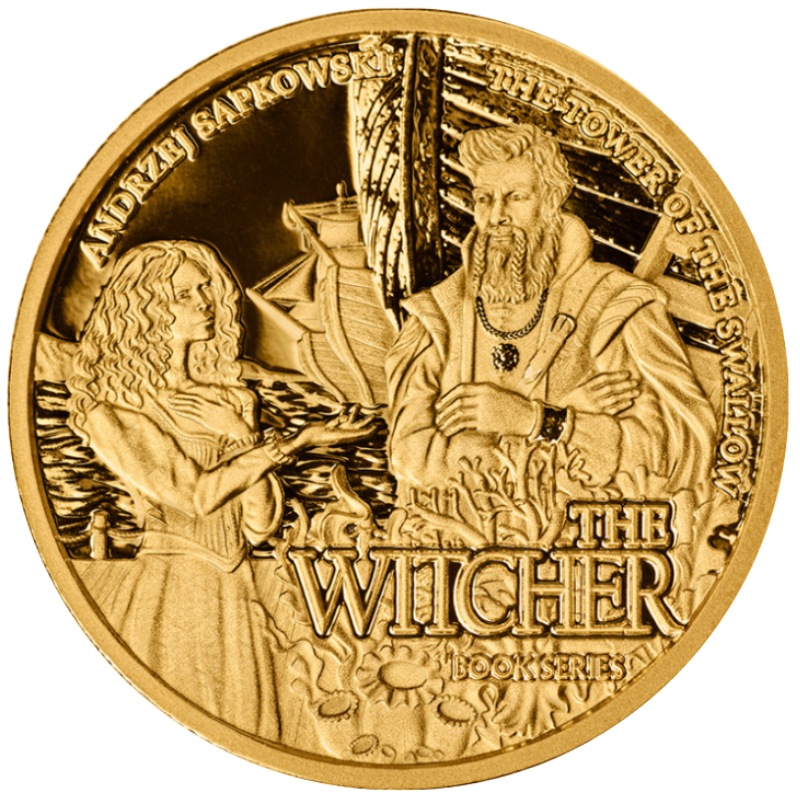 Kompozycję wieńczą napisy: ANDRZEJ SAPKOWSKI oraz THE TOWER OF THE SWALLOW, a u dołu monety lśni znak serii THE WITCHER BOOK SERIES. To prawdziwy kadr zamknięty w złocie – emocjonalny, pełen napięcia i literackiego klimatu.
