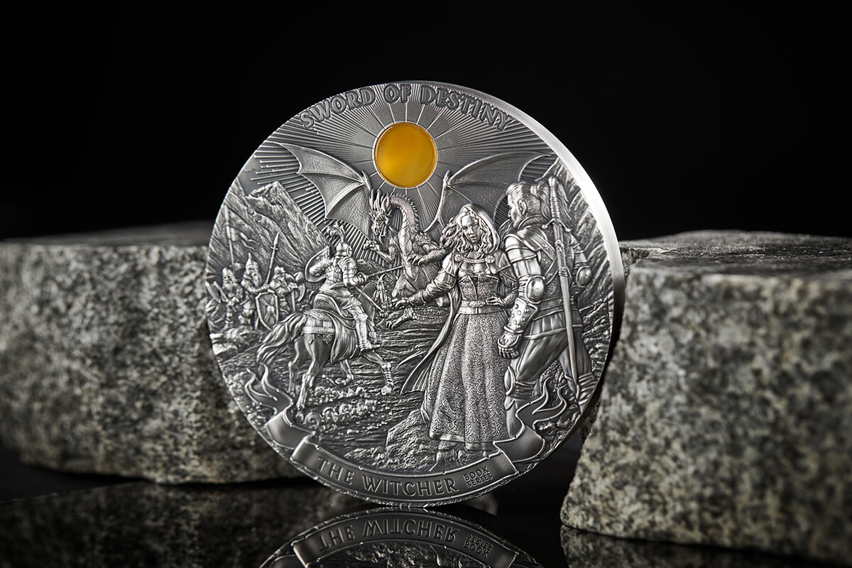The series will include collector coins minted in silver showing important events from the books, minted in gold depicting book characters, bullion coins, and 3D coins depicting scenes from Andrzej Sapkowski's The Witcher Cycle.